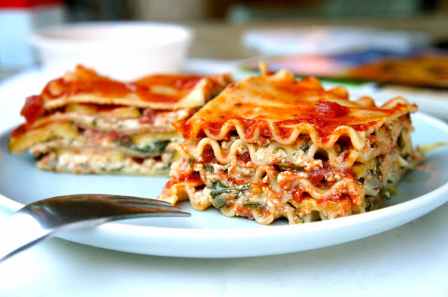 材料:波菜,豆腐泥 (可改為 Ricotta/Chedder 混合),洋蔥,蒜,節瓜,麵,蕃茄丁,蕃茄糊,奧勒岡香草,海鹽,胡椒,橄欖油。