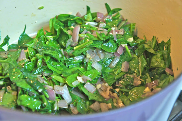 波菜和洋蔥,蒜末,橄欖油,海鹽,胡椒爆香