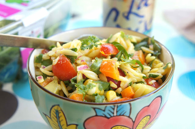 材料:Orzo 義大利麵,紅洋蔥,芝麻葉 arugula,玉米,甜椒,小黃瓜,蕃茄,巴西里