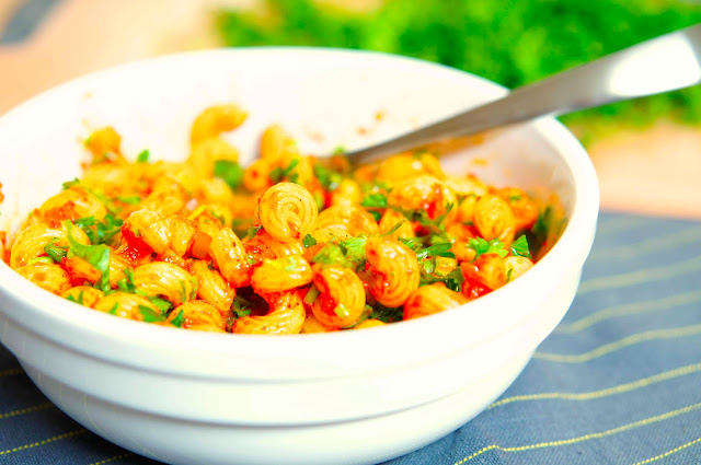 材料:義大利麵,義大利白豆 (cannellini beans),碳烤紅椒茄子醬,洋蔥,蒜,海鹽,胡椒,橄欖油,巴西里。