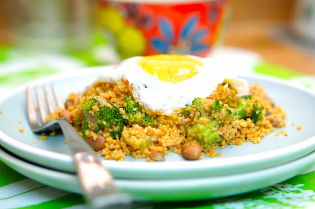 Couscous與高湯和洋蔥翻炒小火悶個 10分鐘,再加入Pinto Beans 和花椰菜,煎個蛋即可