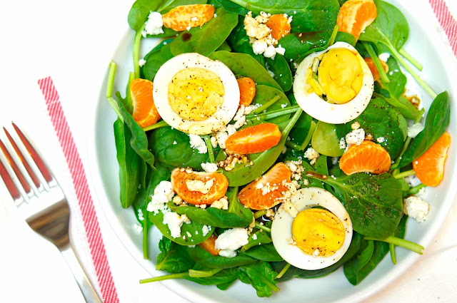 材料:菠菜,小柑橘 (Clementine),水煮蛋,費達起士,海鹽,胡椒,橄欖油,巴沙米可醋。