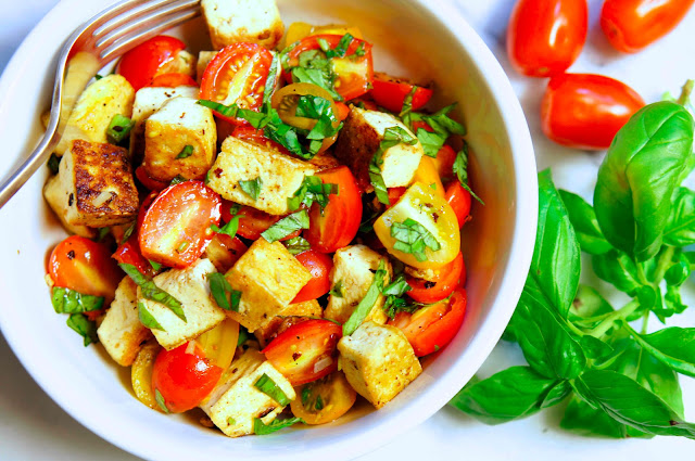 材料:硬豆腐,櫻桃小蕃茄,蒜,羅勒,海鹽,胡椒,橄欖油,巴沙米可醋。