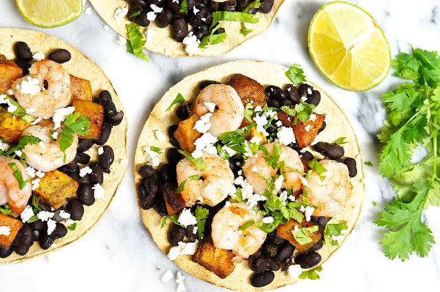 材料:蝦仁,甜蕃薯,黑豆,費達,蒜,香菜,萊姆,Tostada 玉米餅